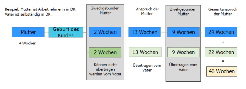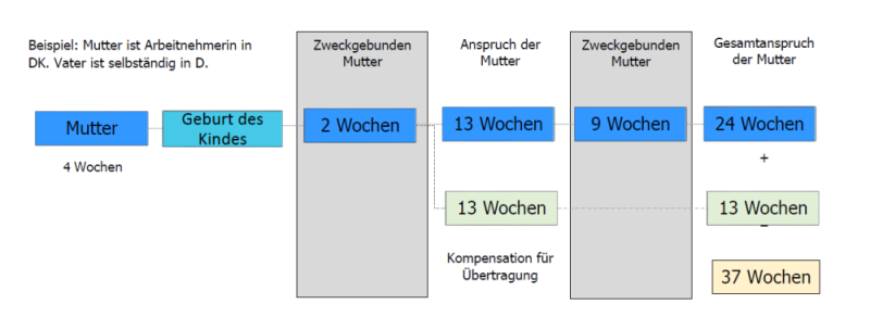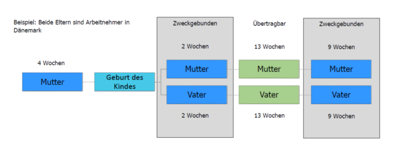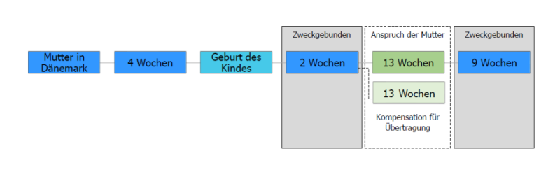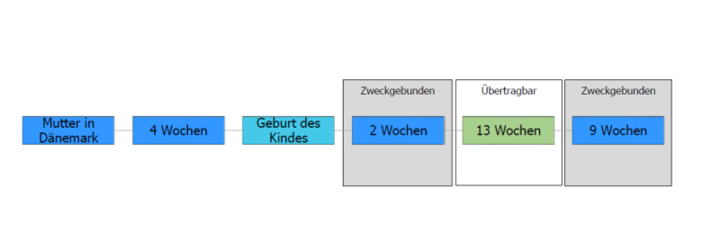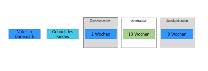 Wenn z.B. der Vater in Dänemark Arbeitnehmer ist, hat dieser nach dänischem Recht Anspruch auf 24 Wochen nach der Geburt. Diese setzen sich aus 2 Wochen Vaterschaftsurlaub und 22 Wochen Elternzeit zusammen, welche wiederum aus 13 Wochen bestehen, die potenziell nach dänischem Recht auf den anderen Elternteil übertragbar wären und 9 Wochen, die bei Arbeitnehmern zweckgebunden sind.