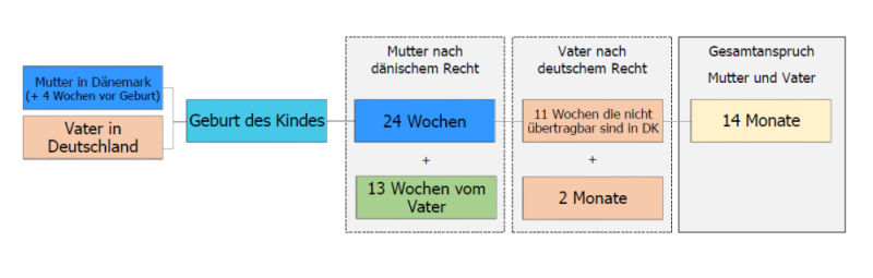 Ist die Mutter Arbeitnehmerin und somit sozialversichert in Dänemark und der Vater in Deutschland, hat die Mutter nach dänischem Recht Anspruch auf 4 Wochen vor der Geburt und insgesamt 24 Wochen nach der Geburt.