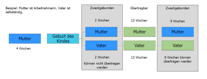 Die 24 Wochen nach der Geburt für den jeweiligen Elternteil setzen sich aus 2 Wochen – die zweckgebunden sind, weiteren 13 Wochen - die übertragbar sind und 9 Wochen – die wieder zweckgebunden sind, zusammen.