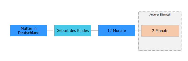 Ist die Mutter Arbeitnehmerin in Deutschland und möchte den größten Anteil an Elternzeit nehmen, hat sie somit einen maximalen Anspruch auf 12 Monate Elternzeit mit Elterngeld nach deutschem Recht.