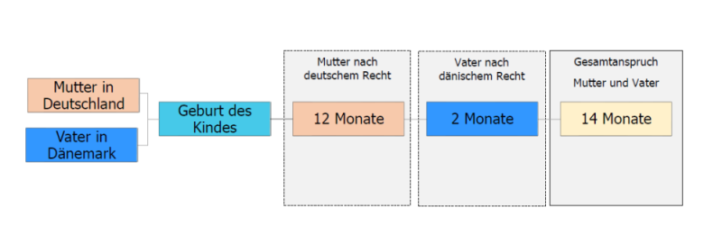 Verzichtet der Vater hingegen nicht auf Elternzeit in Deutschland, könnte er die 11 Wochen ausgleichen, die nach dänischem Recht nicht auf die Mutter übertragen werden können und zusätzlich noch 2 Monate nach deutschem Recht nehmen. Damit würden die Eltern gemeinsam wieder auf die Maximalzeit von 14 Monaten nach deutschem Recht kommen.
